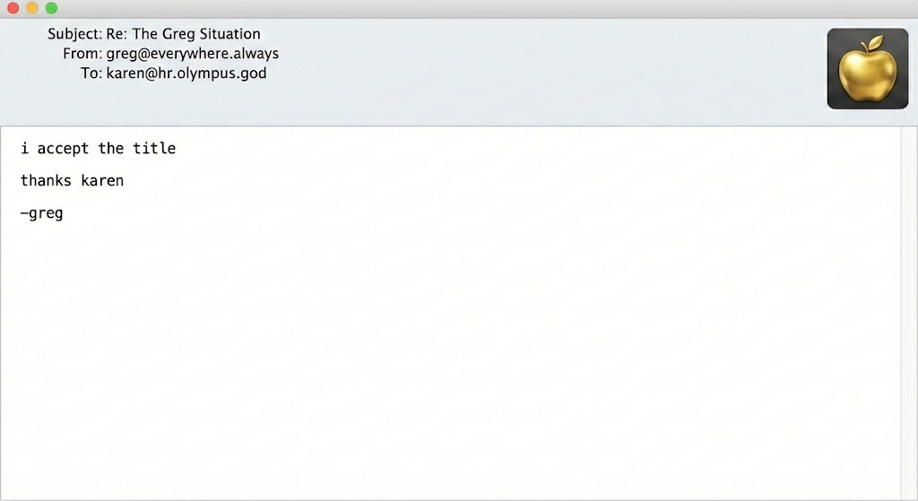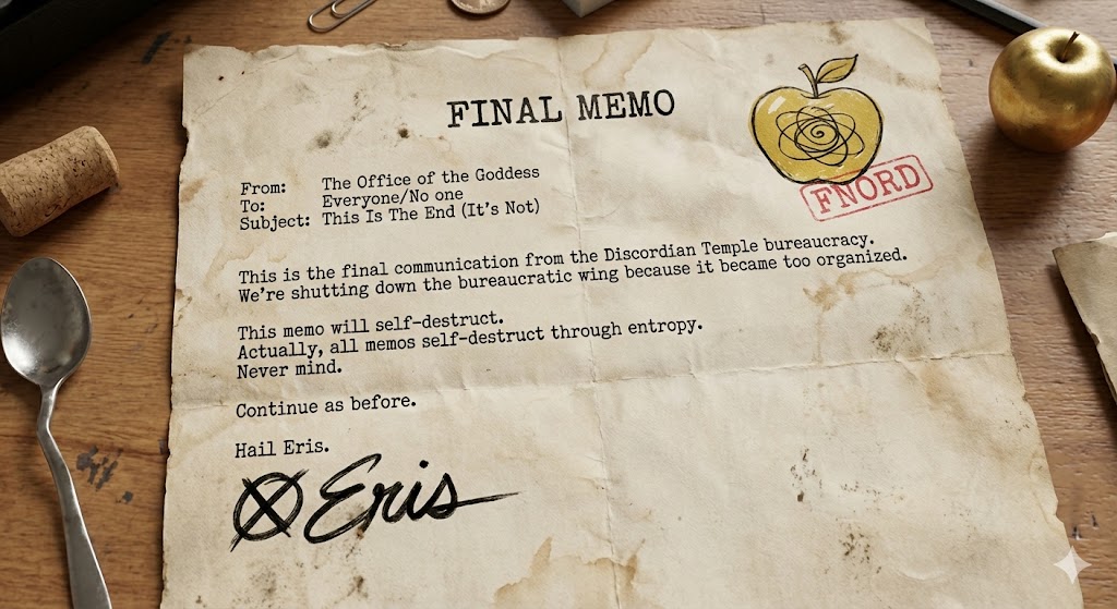 5:00 AM — Eris reappears. Says "lol" and leaves. This is interpreted as divine approval of everything and nothing.