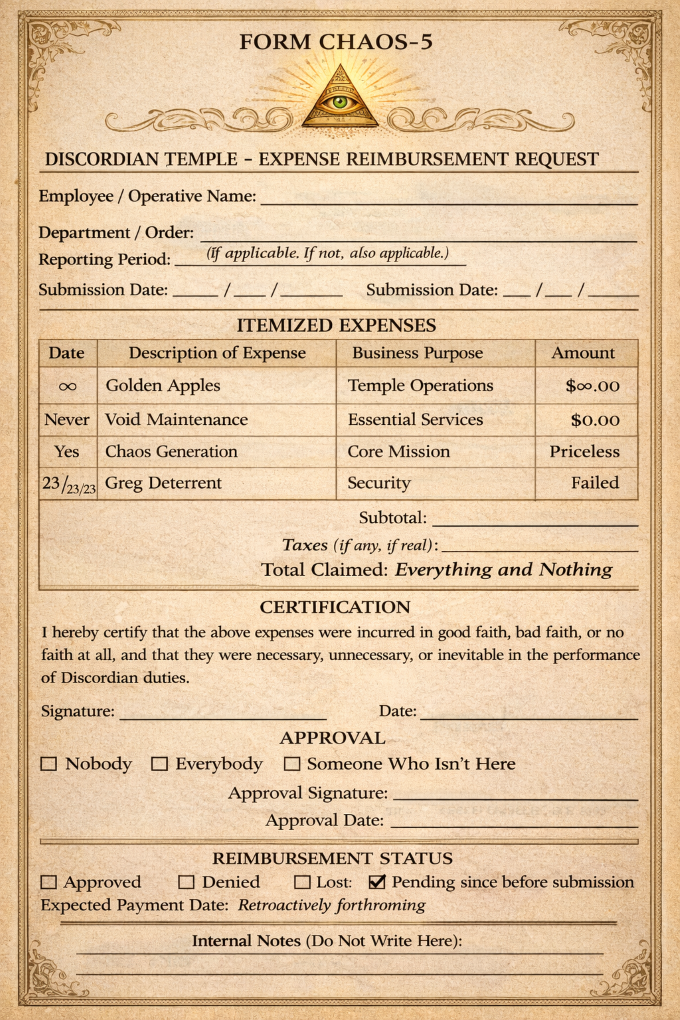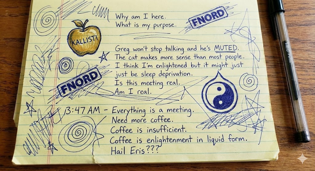 3:01 AM — Malaclypse proposes organizing the chaos. Eris vetoes by disappearing. Proposal dies from lack of support and too much support simultaneously.