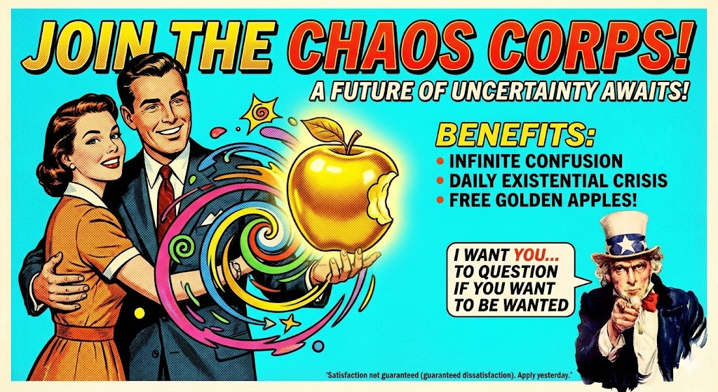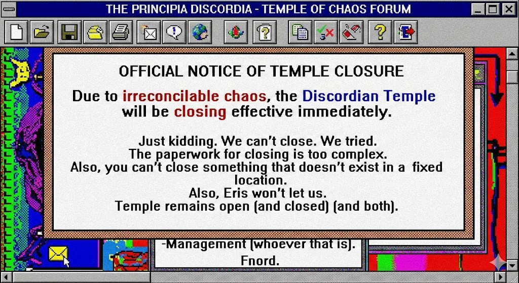 3:01 AM — Malaclypse proposes organizing the chaos. Eris vetoes by disappearing. Proposal dies from lack of support and too much support simultaneously.