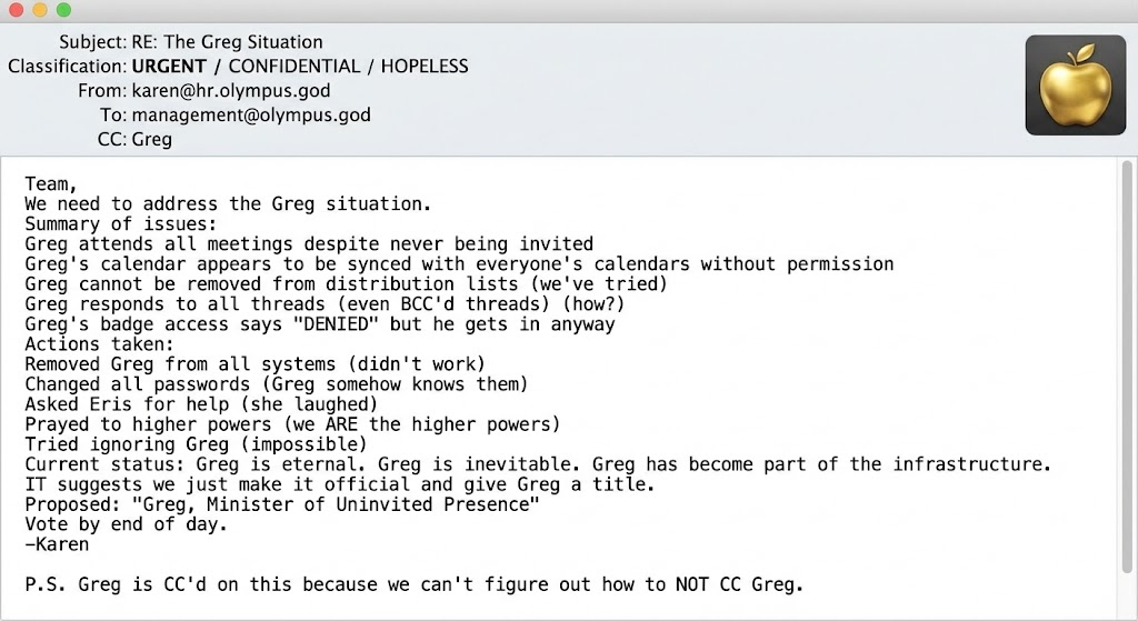 3:07 AM — Greg suggests implementing a structured approach to disorder. Greg is muted. Greg continues talking. No one knows how. Greg's mic is definitely muted. Greg is still audible. This is the first miracle of the meeting.